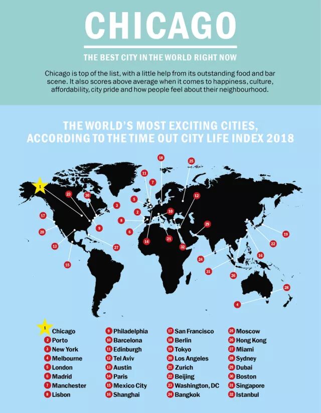 芝加哥打败纽约、伦敦、墨尔本等城市摘得2018年的桂冠。这份榜单对世界范围内的32个城市1.5万人进行问卷调查,根据餐饮、文化、生活成本、艺术等因素计算出各城市指数从而得出排名( The Time Out City Life Index)。