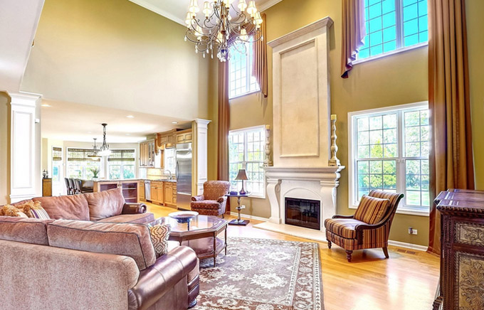 一楼客厅,用两层楼高度与空间烘托大气,尽显尊贵的吊灯,温馨的壁炉,宫廷式落地式窗帘,一切都是精心设计的杰作。