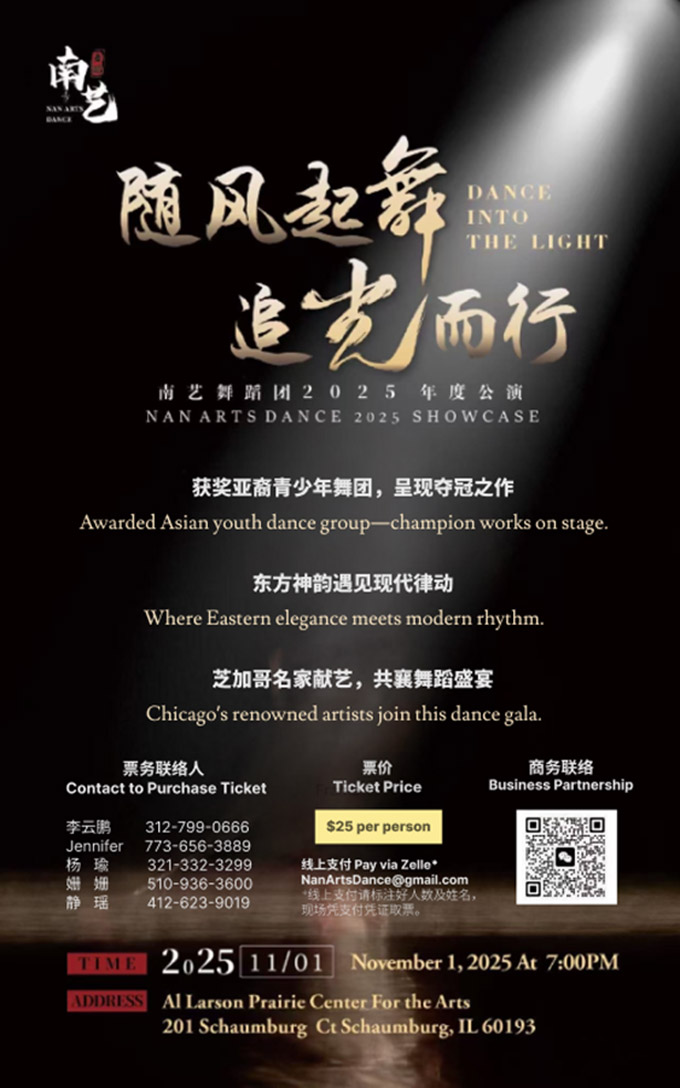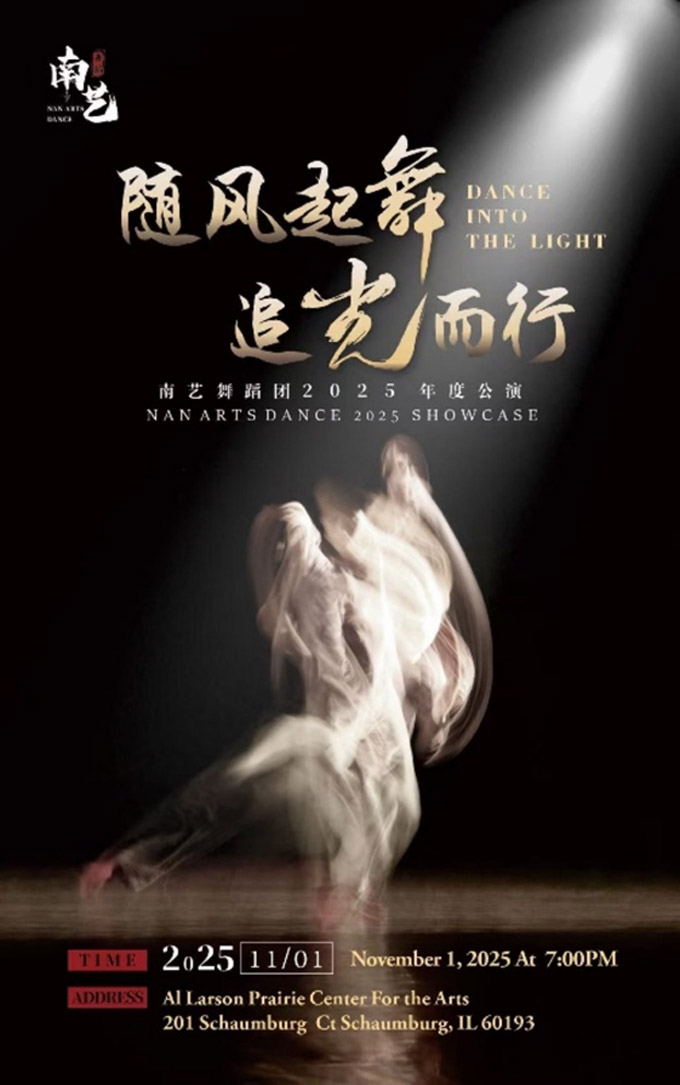 11月1日,南艺舞蹈团2025年度公演《随风起舞·追光而行》将在芝加哥西北郊香柏市(Schaumburg,IL)隆重举行,多支在地区与全美赛事中摘金夺银的少儿舞蹈将震撼亮相,古典与民族、现代与流行,20多个多元舞种将为您呈现力与美的融合,大芝加哥地区众多知名艺术家,古筝、武术、合唱与独唱艺术家们加盟,共襄盛举!