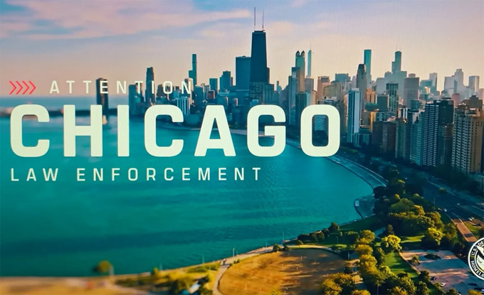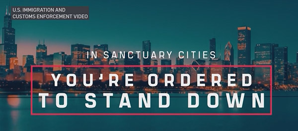ICE针对芝加哥警察队伍的人才争夺广告,画面是芝加哥市的城市天际线,附带的煽情广告词是:“芝加哥的执法人员请注意:你曾经宣誓保护和服务,以确保你的家庭,你的城市的安全。但是在庇护城市,危险的非法移民逍遥自在,你却被勒令退怯。请加入ICE,帮助我们抓捕作恶之极者!”
