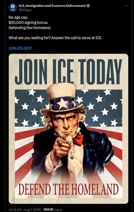 ICE在社交媒体上投放的广告,借用一战、二战期间标志性的山姆大叔招兵广告,宣扬爱国主义,鼓励执法人员加入保卫家园与国土的行列。为了ICE警察的迅速扩编,国土安全部还降低了ICE警察的入职门槛要求,将应聘者年龄要求放松到18岁至40岁均可应聘。