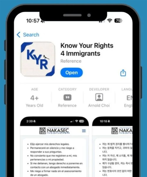 此外,您也可以下载手机应用程序《了解您的权利-移民版》(Know Your Rights 4 Immigrants),该应用程序可选择中文版。在手机应用商店输入Know Your Rights 4 Immigrants即可免费安装。