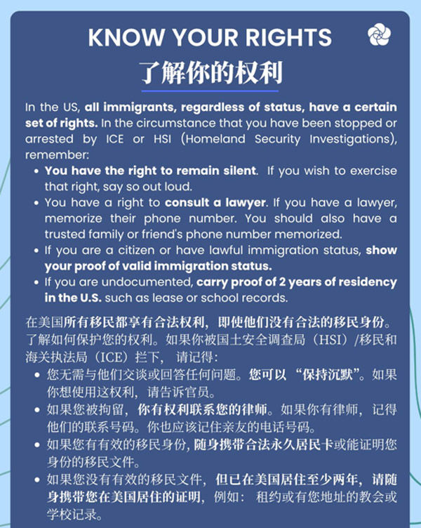 马静仪呼吁华人移民“了解自己的权利”,如果看到移民局执法请立刻记录并向社区组织举报,在居留身份尚未明朗化之前建议非必要不随意出行。