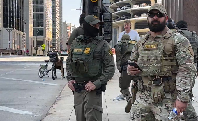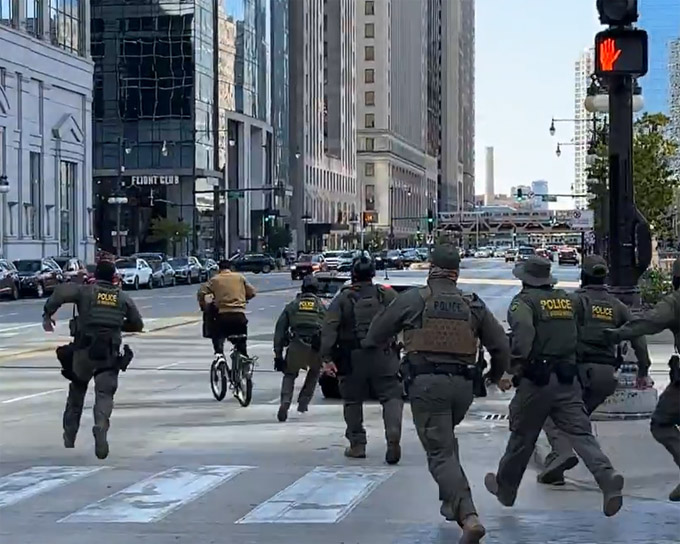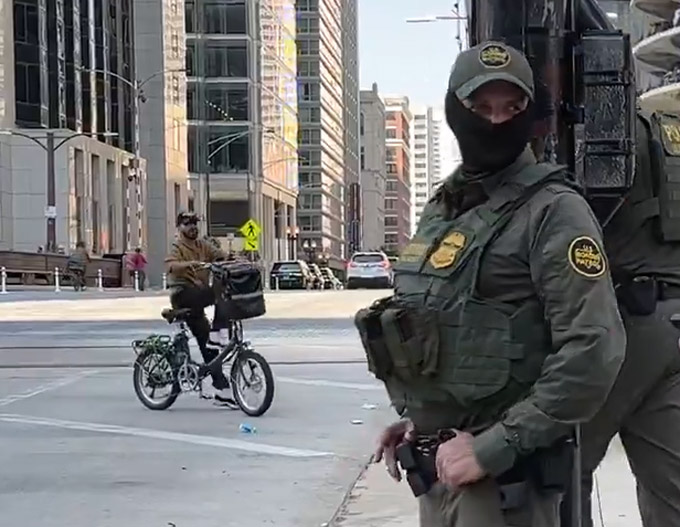 视频拍摄者是芝加哥居民吉尔莫(Patrick Gilmore),上周日正与朋友准备搭乘CTA地铁前往机场,他们走到Dearborn街与Wacker Dirve交汇处附近时碰到大批荷枪实弹的联邦警察在街头行进。队伍行进到街口,一名骑自行车的男子靠近巡逻队,多次向联邦警察喊道:“我不是美国公民,来抓我呀!”