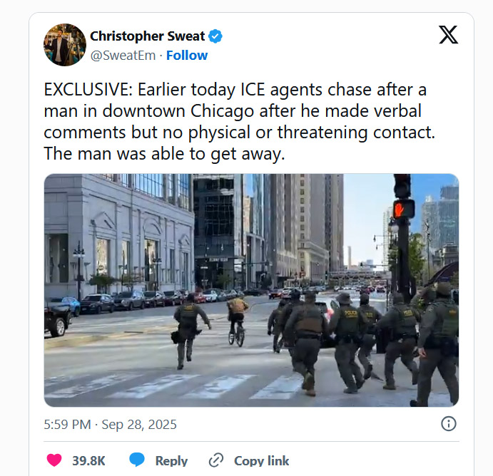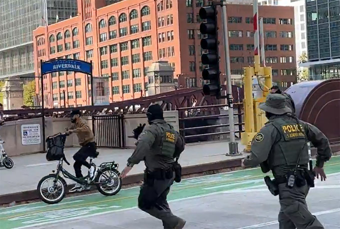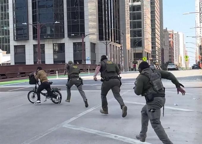 【芝加哥侨学网编译】“我不是美国公民!来抓我呀!”,上周日一名男子骑单车在芝加哥市中心戏弄联邦警察的视频,本周在社交媒体上爆红。