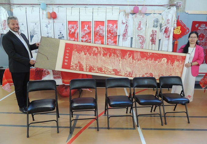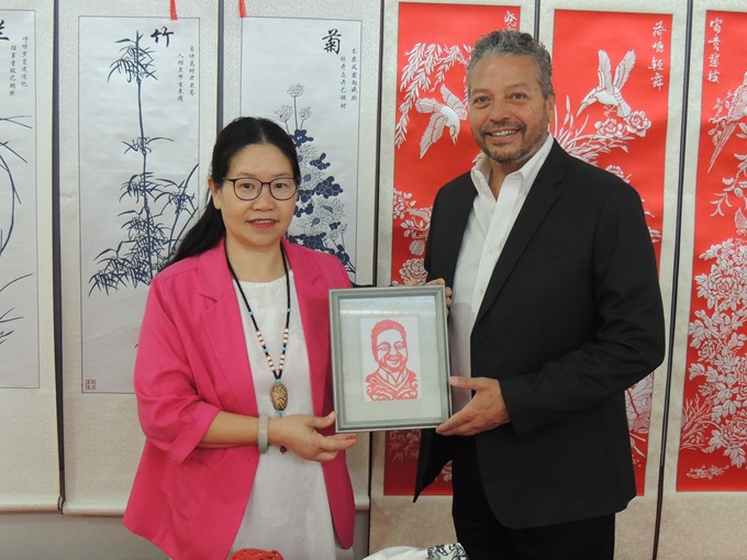 剪纸艺术家张月英向校长Roderick Shaw赠送其剪纸肖像