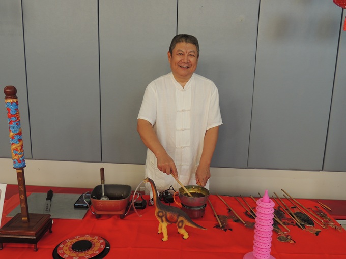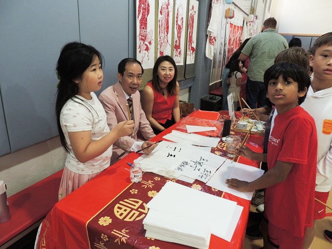 美中文化艺术中心的书法家梅榕松、现场表演书法,并手把手教学生写毛笔字。书法家梅榕松四岁时就开始学习书法,并师从书法大师,练就娴熟的书法技能。