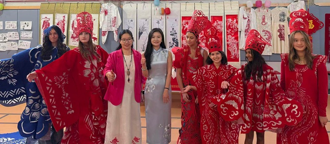 剪纸艺术家张月英的作品深受学生和校长的欢迎。剪纸衣帽成为学生们的时装,学生们穿着剪纸衣服来时装走秀。