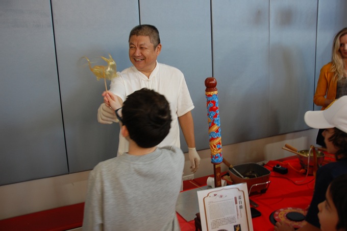 世界非遗促进会大师面塑雕塑艺术家张桐人、剪纸艺术家张月英、糖塑艺术家姜自胜现场表演面塑、吹糖、剪纸等传统手工技艺类非遗项目。