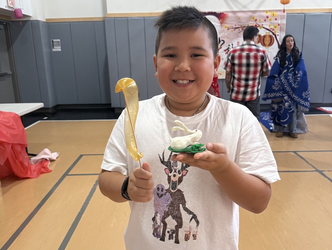 糖塑艺术家姜自胜向学生赠送现成吹制的玉兔糖塑