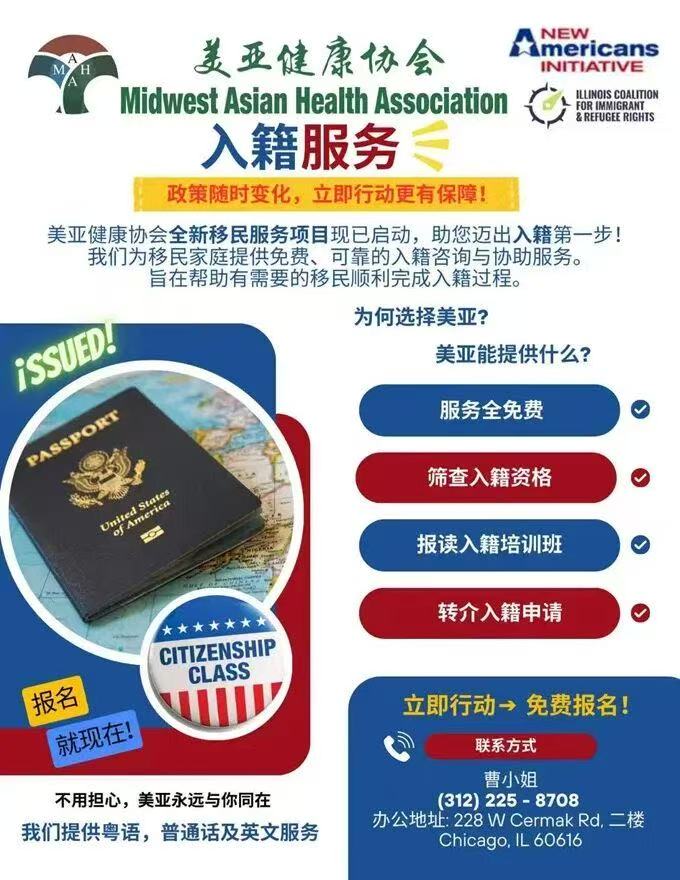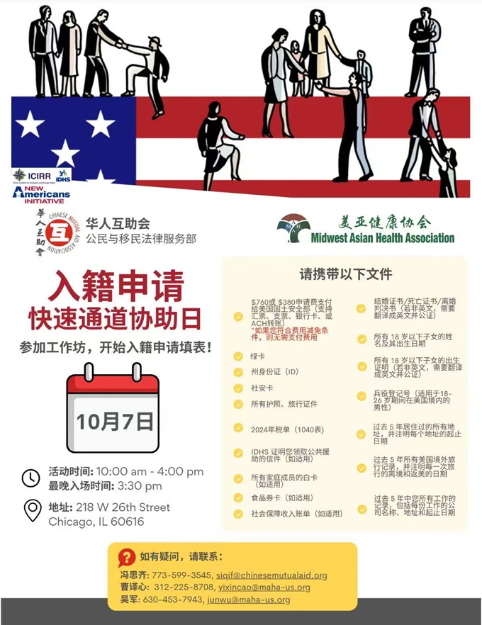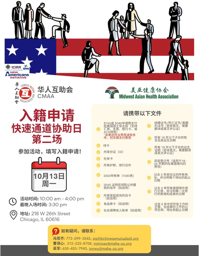 【芝加哥侨学网讯】美亚健康协会公民入籍服务项目。人数爆满。10月7日入籍快速通道协助日巳满员,又加了10月13日-倒计时!!