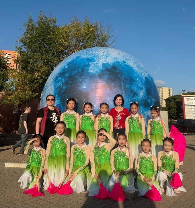 亚裔文化中心校长徐捷雯(后右三)与飞天艺术中心在月球像前合影