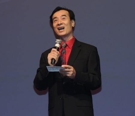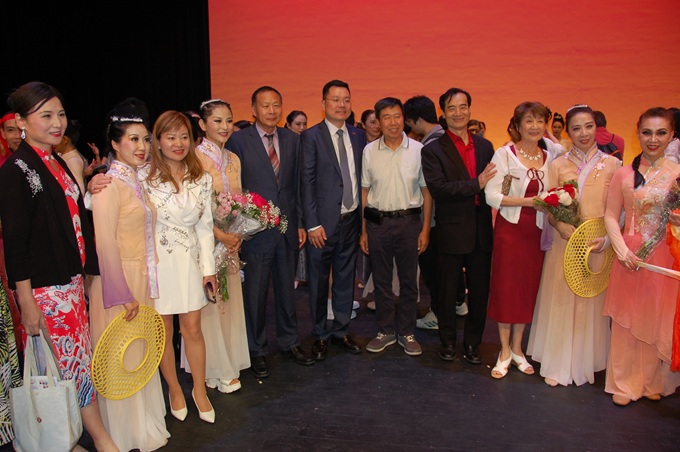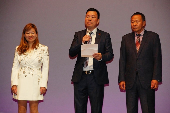 左起,华联会理事长/东方艺术团名誉团长郑征、王义参赞、华联会主席黄正东致辞