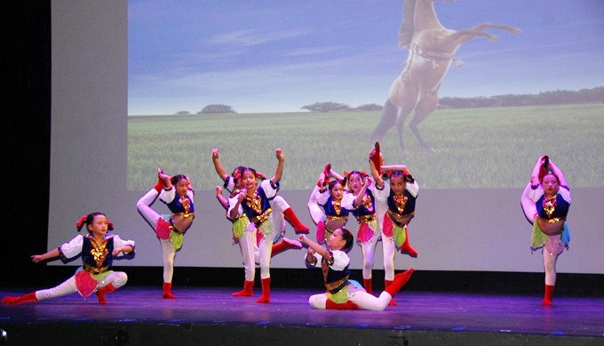 舞蹈《小马奔腾》表现了孩子们像小马一样不畏困难,勇敢坚韧,奔驰在辽阔的草原上。