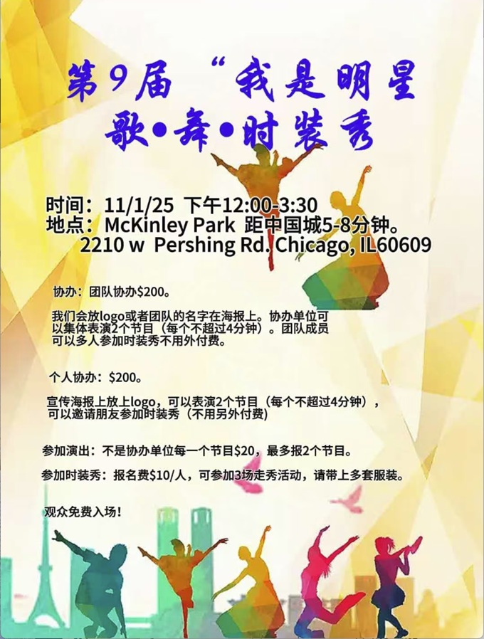 芝加哥人艺第9届“我是明星” 歌•舞•时装秀 将于11/1/25 在McKinley Park 举行!欢迎您或者您的团队参加。