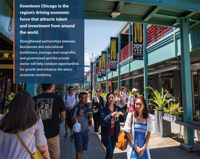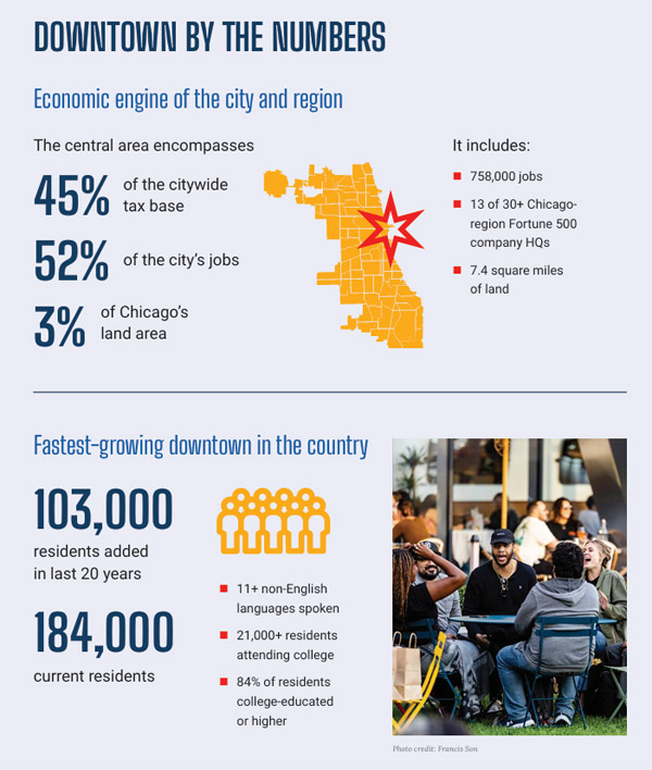 芝加哥市政府将市中心定位为城市与区域的经济引擎,并列出系列数据。市中心只占全市土地面积的3%,却为全市提供了52%的就业,市政府税收的45%。目前芝加哥市中心是13家“财富500强”企业的总部所在地(全市共有30多),市中心共有75.8万就业岗位。