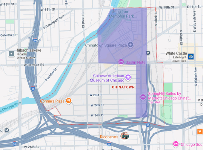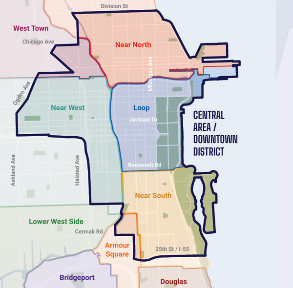在目前的大众共识与市政府官方语境中,中国城是“近南社区”(Near South Side)的一部分,就连毗邻的南环区(South Loop)都不属于“市中心”。