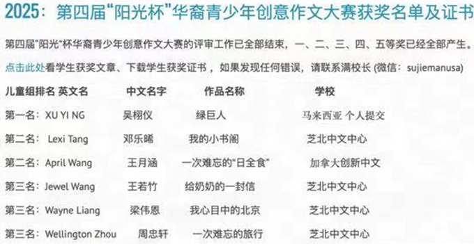 全球各地的学生在第四届“阳光杯”创意作文大赛中获奖