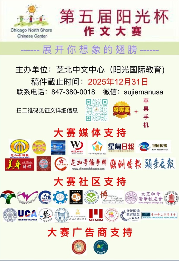 【大赛社区支持】美国华人科学家工程师专业人士协会,大芝加哥地区妇女商会,美亚健康协会,美中文化艺术中心,奇迹广告,美国中西部河南同乡会,英中文化艺术交流协会,大芝加哥地区清华校友会,北京师范大学北美大芝加哥地区校友会,芝加哥人民艺术团,芝加哥网络学苑,麻省理工妈妈公众号, 山东同乡会,美国华人联盟伊州分会,全民阅读教育联盟, 北京科技大学芝加哥校友会,芝加哥美洲华裔博物馆
