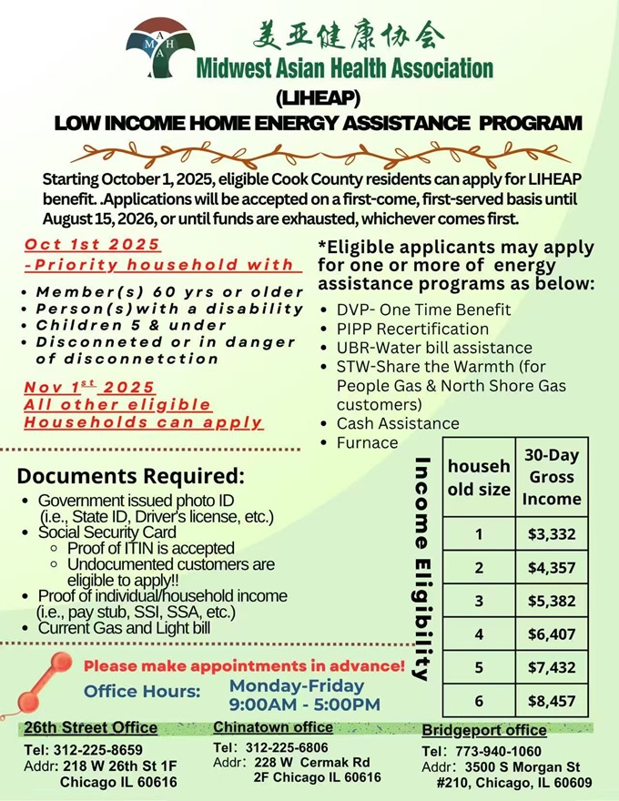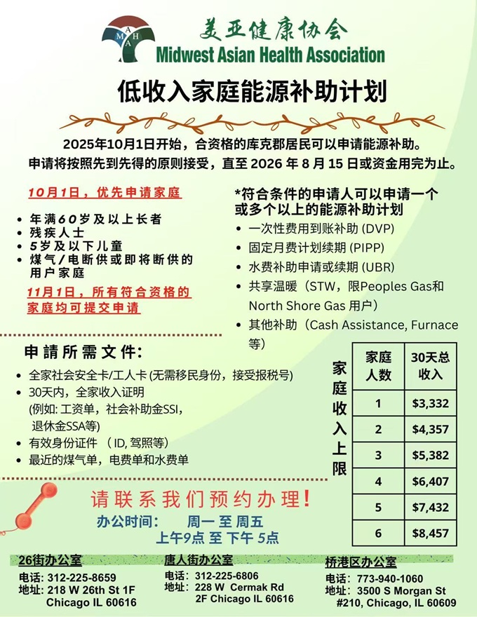 【芝加哥侨学网讯】美亚健康协会通知:一年一度的低收入能源补助申请已经开始接受申请。美亚健康协会欢迎各位符合资格的居民来办理今年的能源补助,美亚多个办公地点可供选择,欢迎来电预约!更多详细内容请参阅海报。