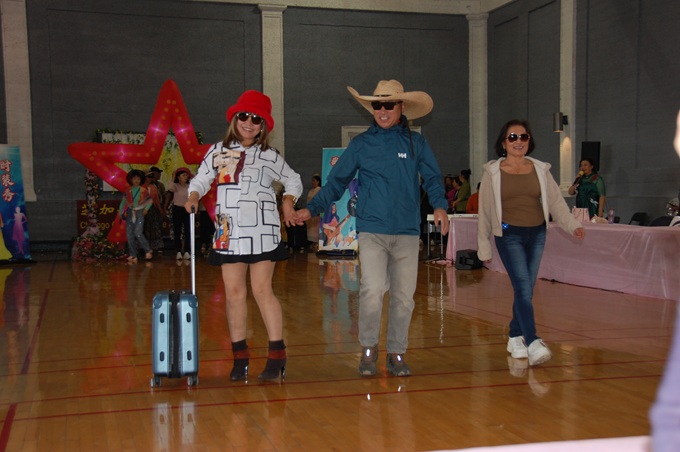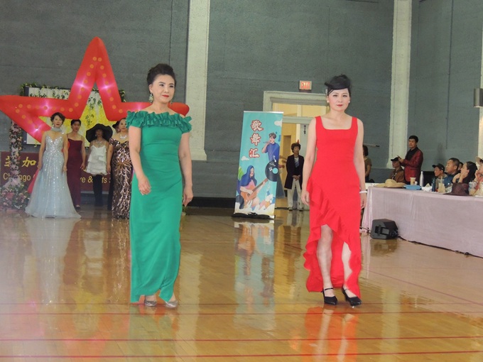 在走秀1,休闲民族风部分,在表演精彩歌舞节目的同时,还有金吉尔自驾游芝加哥分会的旅游时装秀、芝城乒乓球爱好者团队的体育时装秀。