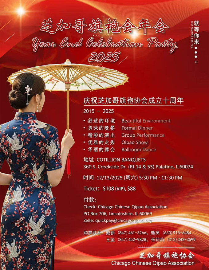【芝加哥侨学网讯】芝加哥旗袍协会成立十周年庆典,将于12月13日在芝加哥西北郊 Cotillion Banquets隆重举行。届时将有舒适的环境、美味的晚餐、精彩的演出、优雅的走秀、华丽的舞会!