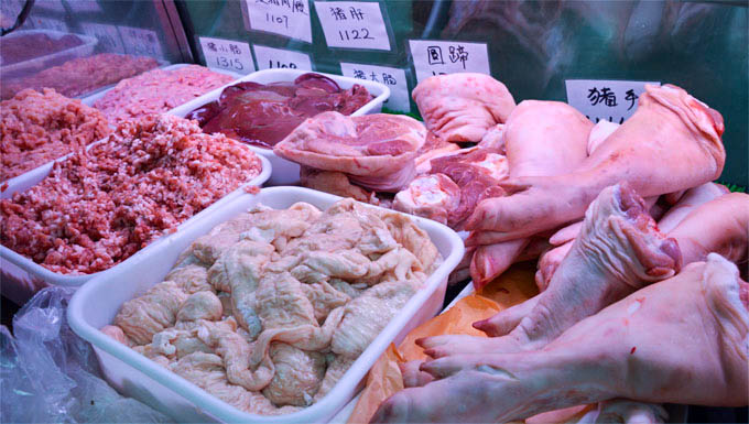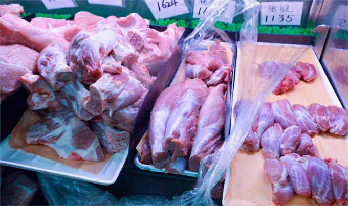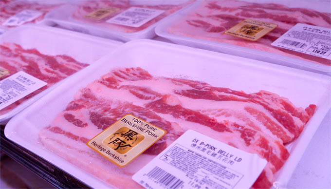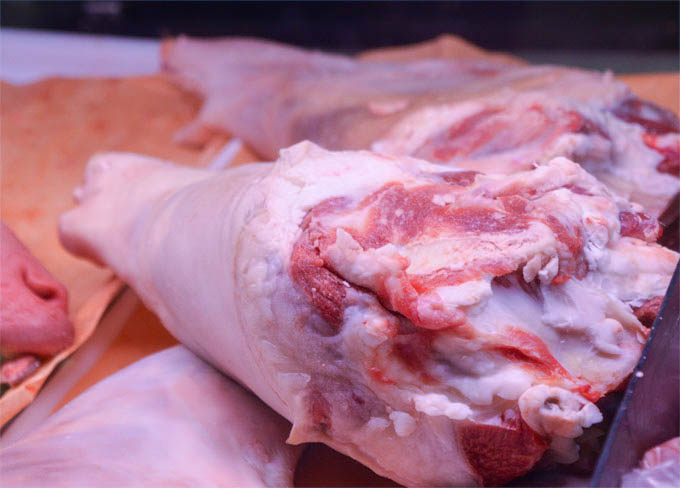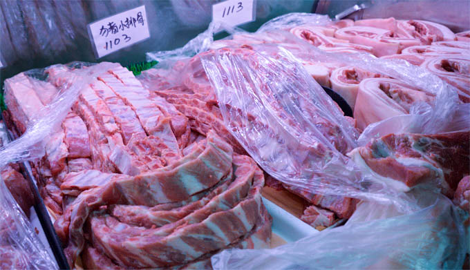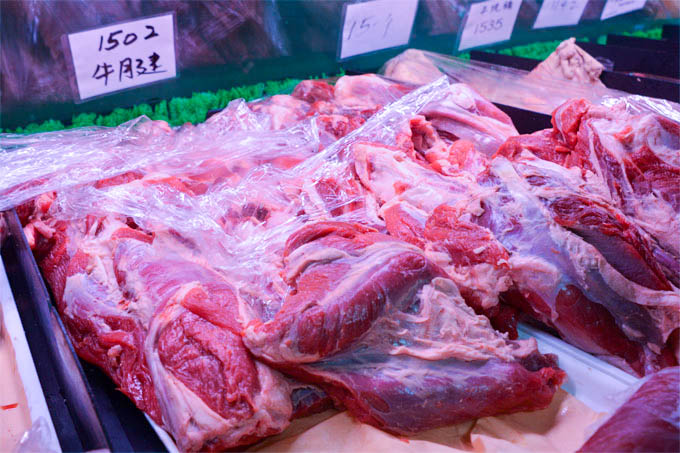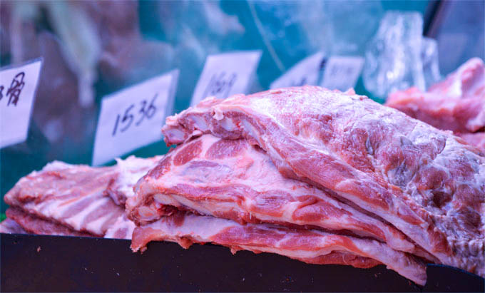 猪肉同样也是每天从屠宰场进货,而且几乎是每周七天天天进货,保证肉质新鲜。考虑到个头与尺寸,猪肉类则是按部位批量进货,品种最丰富。梅花肉、里脊肉、五花肉、猪肘、圆蹄、前蹄;排骨、扇骨、颈骨、脊椎骨;猪头肉、猪舌、猪肝、肥肠、小肠、猪心、猪血等美味猪杂碎,88超市肉品专柜一应俱全。