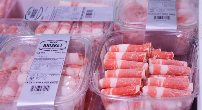 在88超市的火锅料理冰柜专区,最近也有高档肥牛新货到!美国本土农场养殖,牛腩最佳部分精细切片处理。