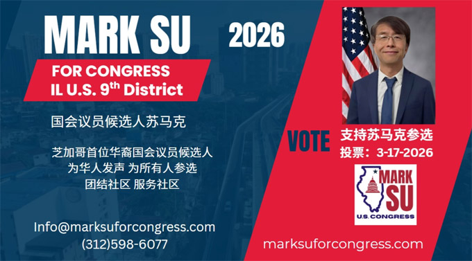 【芝加哥侨学网讯】芝加哥地区华裔人士苏东波(Mark Su)将竞选伊州第九选区国会众议员。在11月份伊利诺州选举委员会的国会议员候选人资格申请审核中,苏东波获得零反对,成功登上2026年3月17日的初选选票,成为芝加哥及伊州有史以来的首位华裔国会议员候选人。