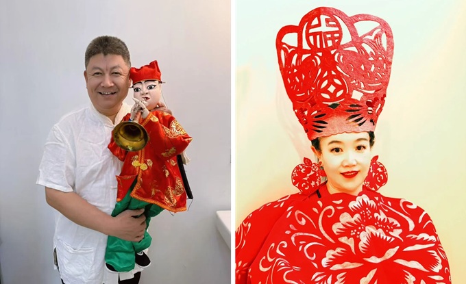 左起,吹糖高手姜自胜、剪纸艺术家张月英