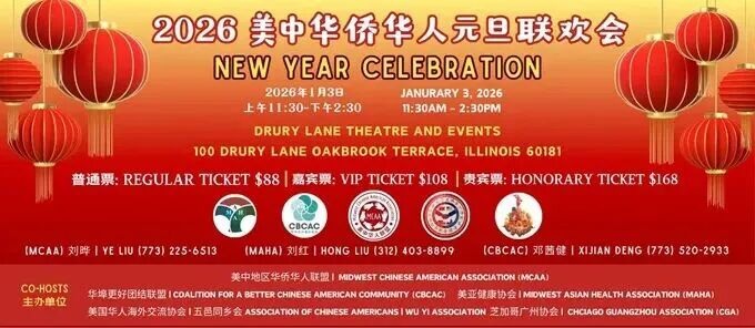 【芝加哥侨学网记者王坚报道】2026美中华侨华人元旦联欢会将于1月3日(星期六)在芝加哥西郊朱瑞莲酒店举行。