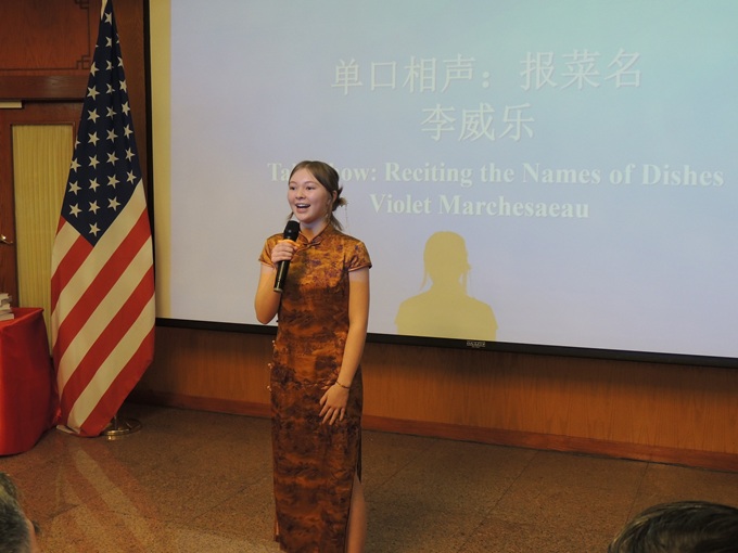 学生作者代表Zoey Cardamone,用十分流利的中文,讲述了中国之行对学习中文和中国文化的帮助,很高兴有机会与中国人用中文交流。在学校里学习中文,可以参与很多中国文化活动,让自己感到学习中文很有意义。中文学习还帮助自己扩展国际视野和成为世界公民。