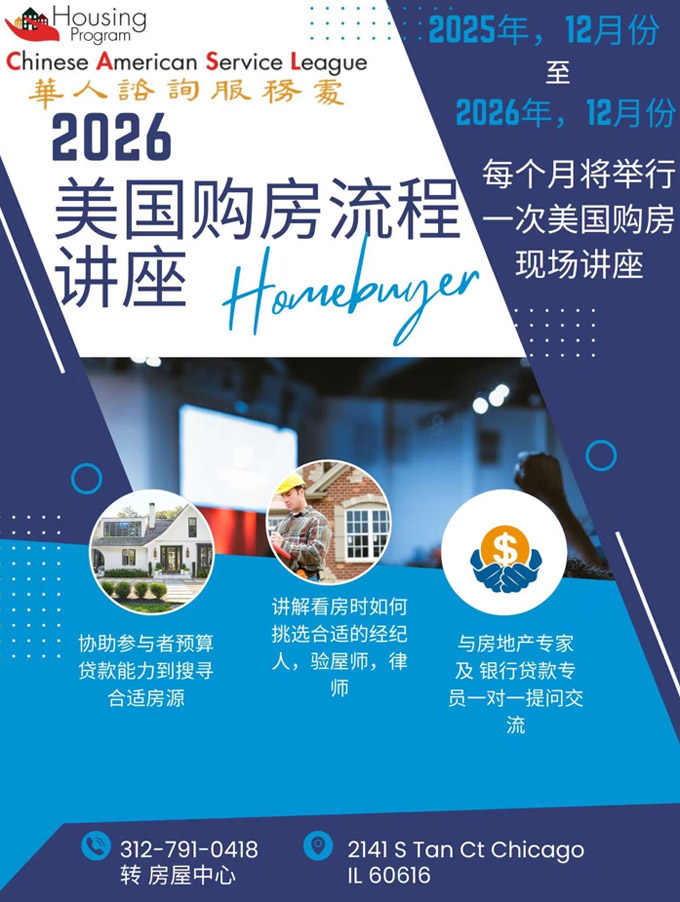 华人咨询服务处(Chinese American Service League)是美国中西部首位及芝加哥唯一获美国住房与城市发展部(HUD)认可提供房屋理财中文服务的华人社区非牟利机构。中英双语资深房屋顾问为你提供有关免费的房屋一对一辅导及协助,并每月举办不同类别的教育讲座为社区居民普及知识。