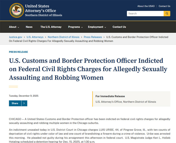 2022年2月,在西北郊香柏市(Schaumburg)的一家旅馆,嫌犯尤瑞贝敲开卖淫女所在的房门,声称自己是警察,并出示警方证件,以警方办案为由强行进入房间。进入房间后,嫌犯强行将受害者的头按在床上,用枪指头,强迫受害者口交。受害者拿出现金求饶,嫌犯拿走现金离开时还继续拿枪威胁。据受害者的描述,嫌犯出示警察证件与CBP联邦警察证件的特征相符。