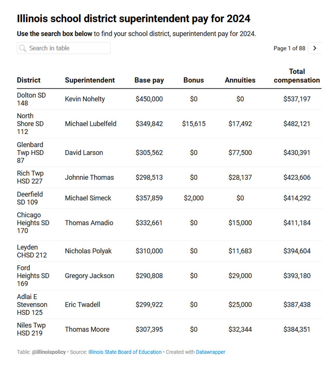 芝加哥南郊多顿148学区(Dolton School District 148),学区总监的年薪高达54万美元,位居伊州榜首。