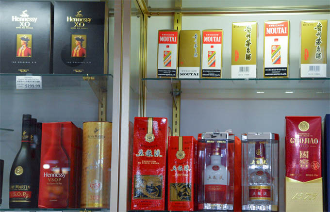 在88超市酒水专柜区,轩尼诗干邑,人头马XO与茅台、五粮液,中西名酒交相辉映,此外还有来自加州那帕酒庄的葡萄酒,爱尔兰威士忌,法国白兰地,世界各地精品荟萃。