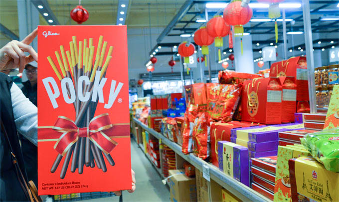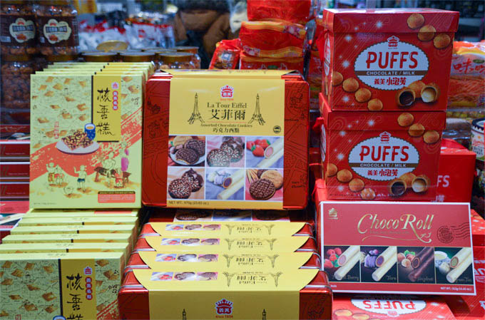 88超市入口处最的节庆畅销礼品展示区,来自中国大陆、香港、台湾的新款礼盒,来自日本、韩国及东南亚地区的畅销零食,蔚然壮观,选择丰富。