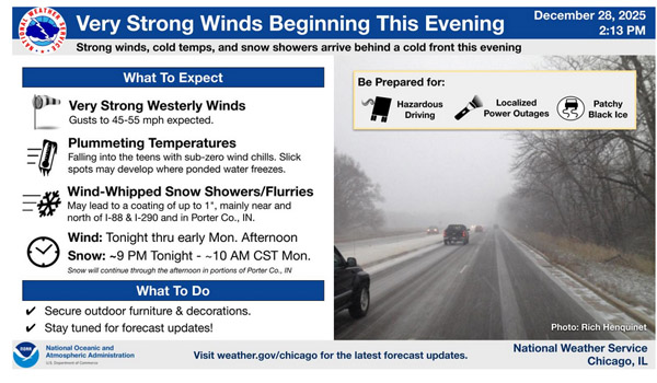 【芝加哥侨学网综合编译】在经历了反常的温暖圣诞假期之后,极端天气横扫芝加哥地区,国家气象局周日先后发布三重冬日天气警报:冬日风暴、龙卷风、强风。寒风呼啸之中,本周气温骤降,寒风中的体感温度可低至摄氏零下18度,芝加哥的居民将在寒冷中迎接2026新年元旦。