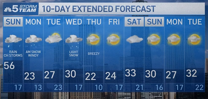周日芝加哥最高气温为56华氏度,本周一最高气温则只有23华氏度,未来十天之内气温都将在维持在华氏20多度、30出头的温度,夜间最低气温可能低至华氏10度,芝加哥地区将在寒冷中迎接2026的到来。
