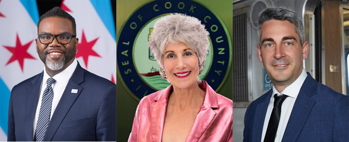 已公开宣布将竞选下届市长的候选人名单,左起:现任市长Brandon Johnson, 库克郡财长Maria Pappas,商界人士Joe Holberg
