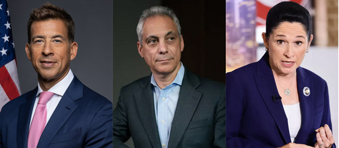 潜在市长候选人初步名单,左起:州务卿Alexi Giannoulias,前驻日大使、芝加哥前市长Rahm Emanuel,伊州审计长Susana Mendoza