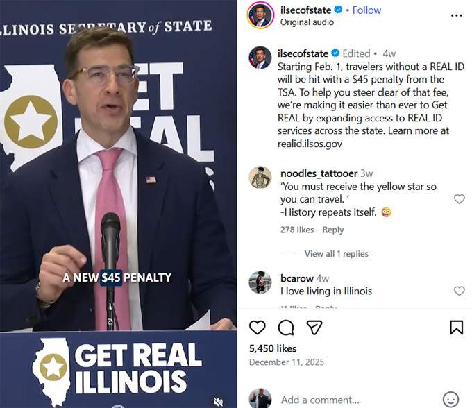 由于民众习惯携带驾照乘坐国内航班,因此官方鼓励居民申办真实驾照。真实驾照可向州务卿办公室(DMV)申办。伊州标准驾照会注明“联邦层面会有限制”(Federal Limits Apply)、真实驾照的右上角会有小星星标识。