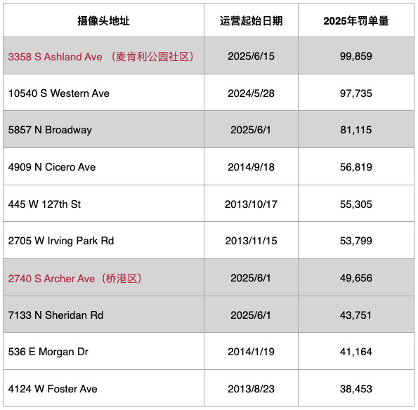 2025芝加哥超速摄像头罚单前十名,灰底为2025年新增,红色位于华人聚居区