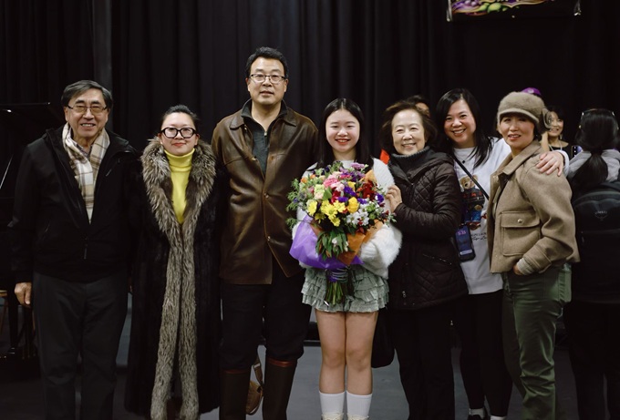 水立方大赛评委朱毅(左)、密城的高莹老师(右)、左三起,水立方大赛评委武炎炎、水立方大赛三次冠军桂馨予、水立方大赛评委杨左等人合影