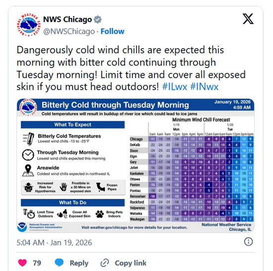 国家气象局针对芝加哥地区发布的酷寒预警直到本周一中午才结束,酷寒伴随时速高达40英里的寒风,让最低体感温度降至华氏负25度,人体皮肤直接暴露在这样的酷寒中最快30秒就可能出现冻伤。阵雪加上狂风会让开阔地带出现能见度方面的白化问题,对交通安全构成隐患。