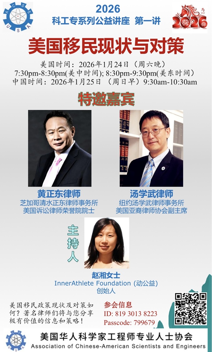 【芝加哥侨学网讯】美国移民政策现状及对策如何?美国时间2026年1月24日晚, “美国华人科学家工程师专业人士协会” (简称:科工专, The Association of Chinese-American Scientists and Engineers, ACSE)成功主办了举办了公益讲座- “美国移民现状与对策”。当晚的主持人是赵湘女士。嘉宾是(按alphabetical order)黄正东律师,汤学武律师。