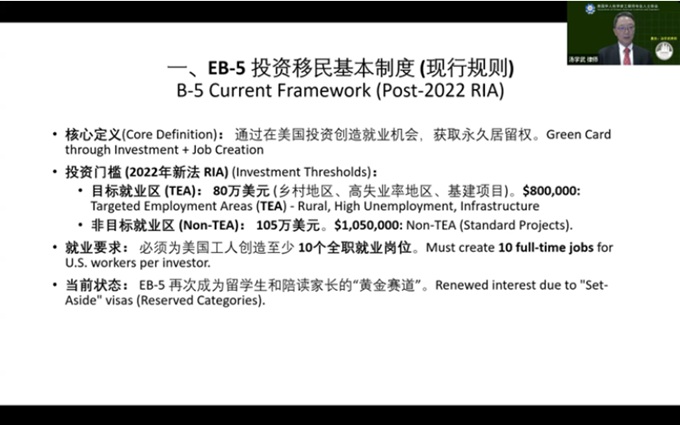 汤学武律师则重点介绍了 EB-5 投资移民政策的发展与现行制度。他回顾了 EB-5 自 90 年代设立以来的演变过程,并解读了 2022年3月份改革后对乡村项目、高失业地区项目及基建项目的优先处理安排。目前 32% 的优先配额中,20%分配给乡村项目,10%分配给高失业地区项目,2%分配给了基础建设项目;其中乡村项目的优先审理,在所有的投资移民项目中速度最快,通常为 12–18 个月。汤律师同时强调了 EB-5 项目的合规要点,包括资金来源合法性、就业创造标准以及项目真实性,提醒申请人警惕“伪乡村项目”风险。汤学武律师还特别提醒,EB-5 申请人若希望享受 同时递交(Concurrent Filing) 的政策便利,需在美国境内递交申请,并注意 2026 年 9 月 30 日前提交申请 以获得“祖父条款(grandfathering)”保护。