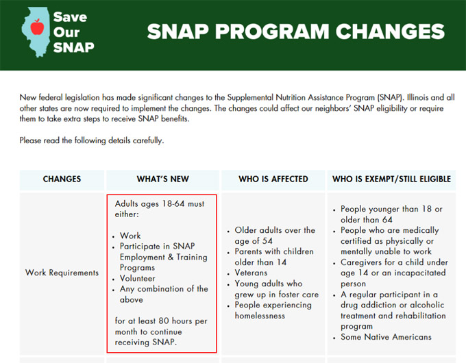 【芝加哥侨学网综合编译】针对低收入家庭的联邦政府粮食卷福利补贴(SNAP)2月1日起将出现重大政策变动:18岁至64岁的粮食券领取者,如果家中没有14岁以下的小孩,每个月都必须工作或从事义工服务至少80小时才能继续领取粮食卷福利。