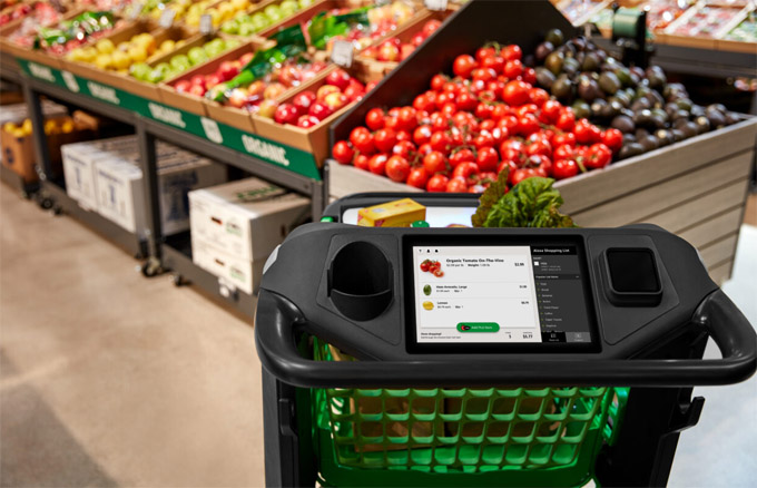亚马逊蔬菜店的无人结账系统,物品放入购物车即可自动结算,无需收银员