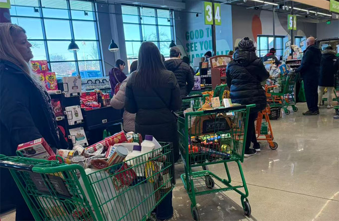 芝加哥西郊Naperville亚马逊蔬菜店关店甩卖,人们抢购排长队。关店大甩卖之际,无人结账系统已无法使用